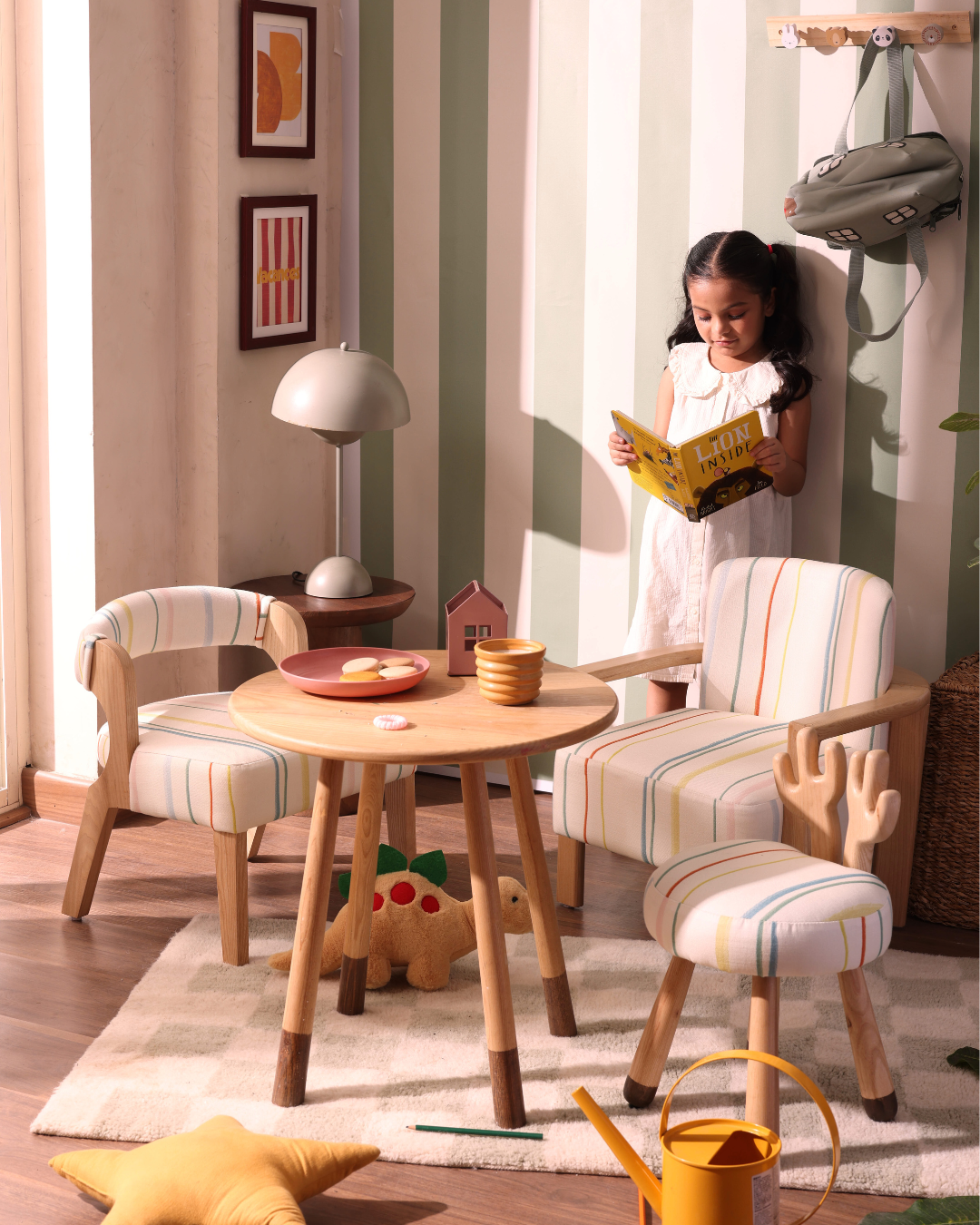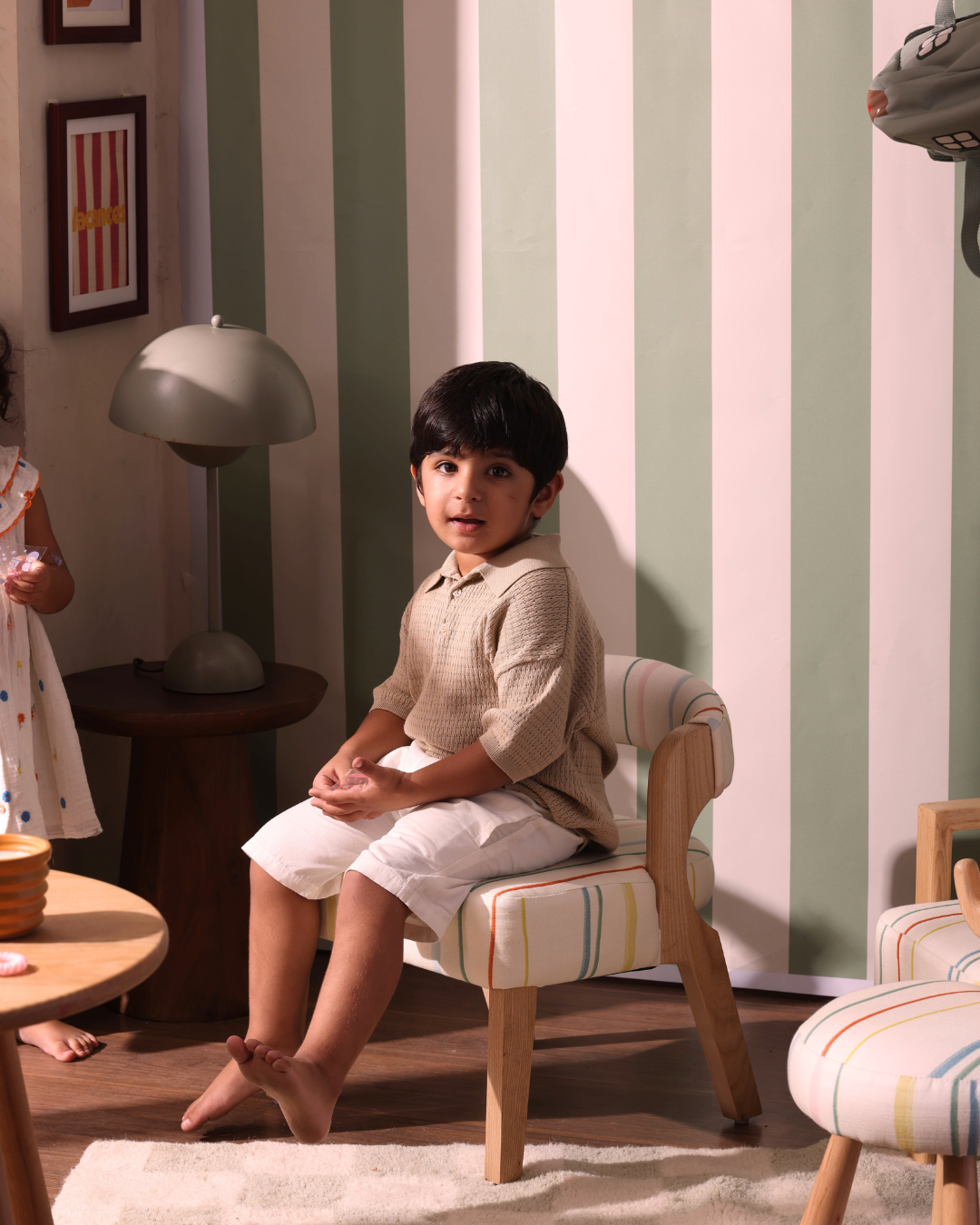 Simple, stylish, and child-friendly, this chair features soft multicolored stripes and a gently curved backrest. Built as a single solid piece, it arrives fully assembled—no setup needed. The fabric is easy to clean and stain-resistant, making it perfect for everyday use in playrooms, bedrooms, or reading corners.