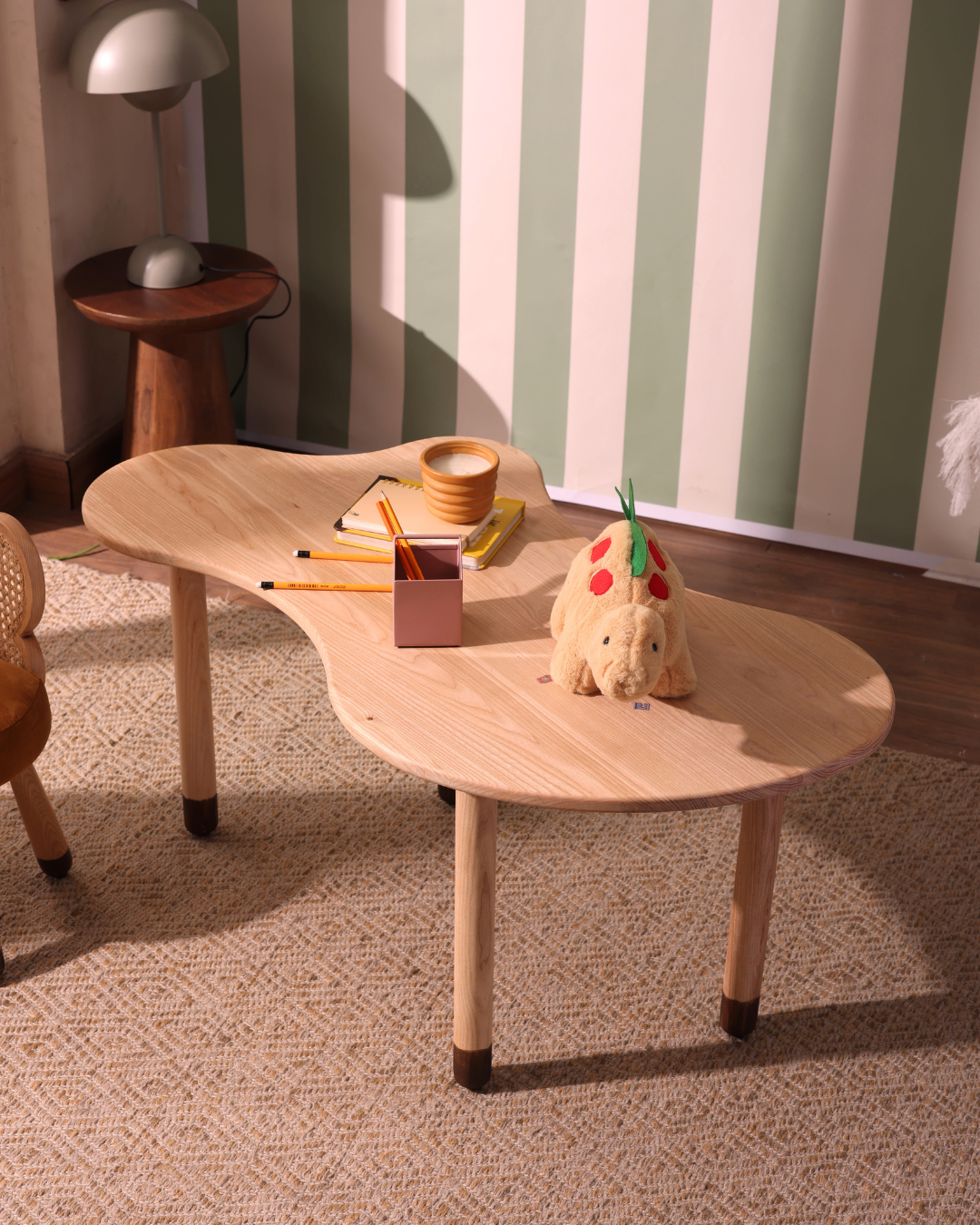 This modern wooden kids’ activity table features a playful, organic shape that blends functionality with style. Crafted from smooth, natural wood, it rests on sturdy rounded legs with contrasting dipped ends for a charming finish. Its spacious dual-surface design offers plenty of room for play, drawing, reading, or crafts, making it perfect for a child’s bedroom, playroom, or creative corner. With its soft edges and warm tones, the table adds a cozy aesthetic to any space while ensuring safety and durability for everyday use.