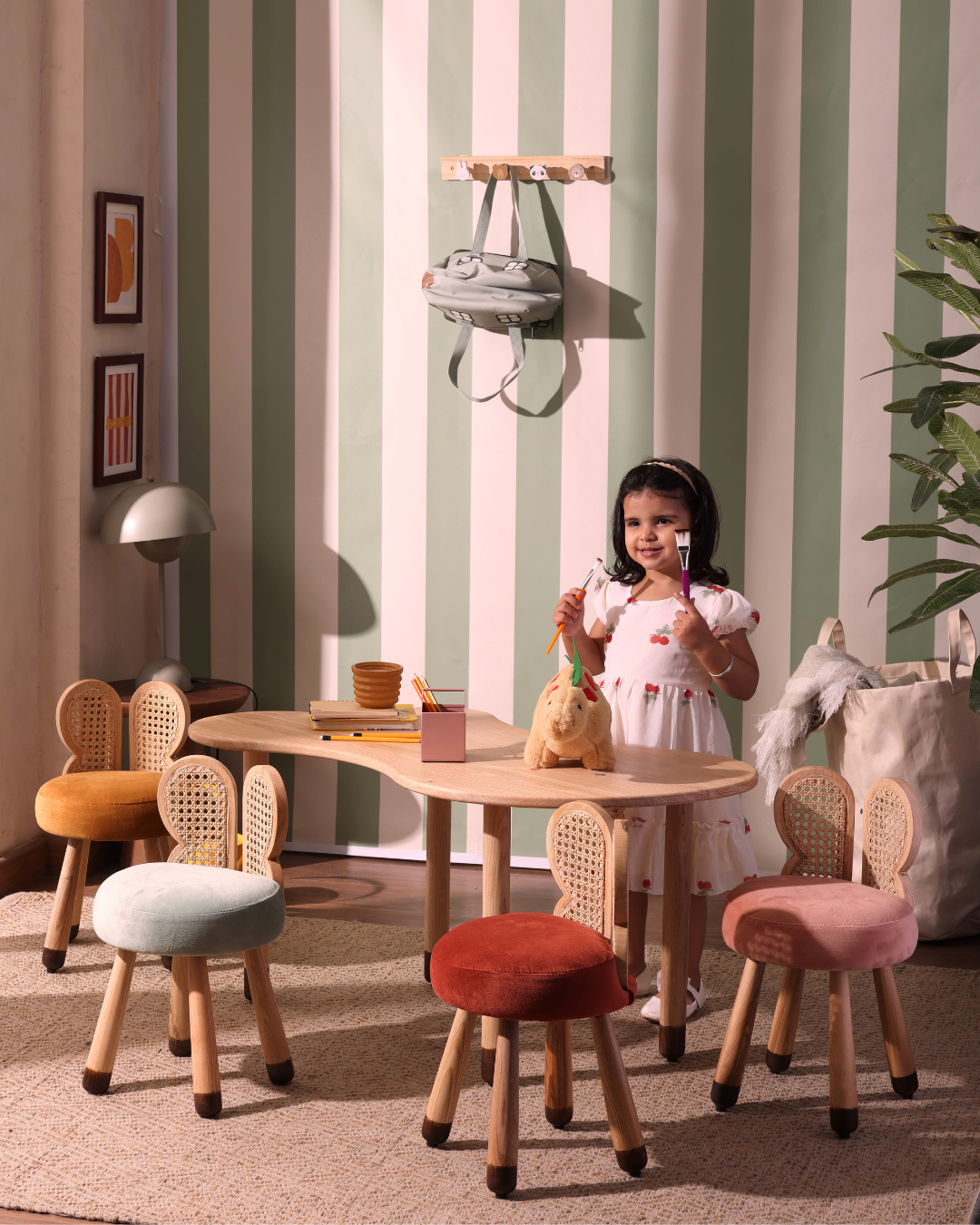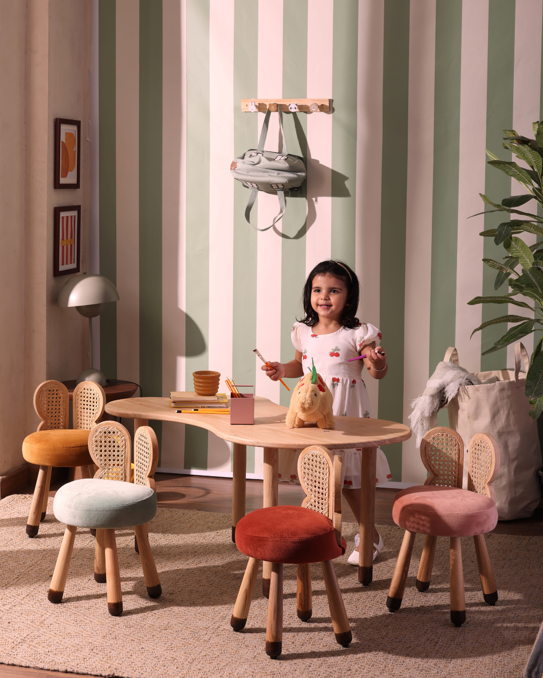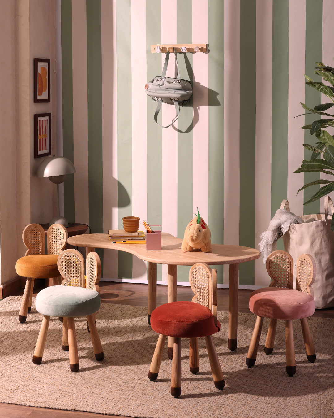 Along with four kids’ chairs brings playful elegance to any space. Each chair features adorable bunny-ear backrests crafted in natural rattan, paired with a soft, velvety cushioned seat in beautiful pastel and earthy tones. Built on sturdy wooden legs with dipped tips for added character, these chairs are perfect for playrooms, reading nooks, or activity tables. Designed for comfort, durability, and style, this set adds a touch of magic to everyday moments.