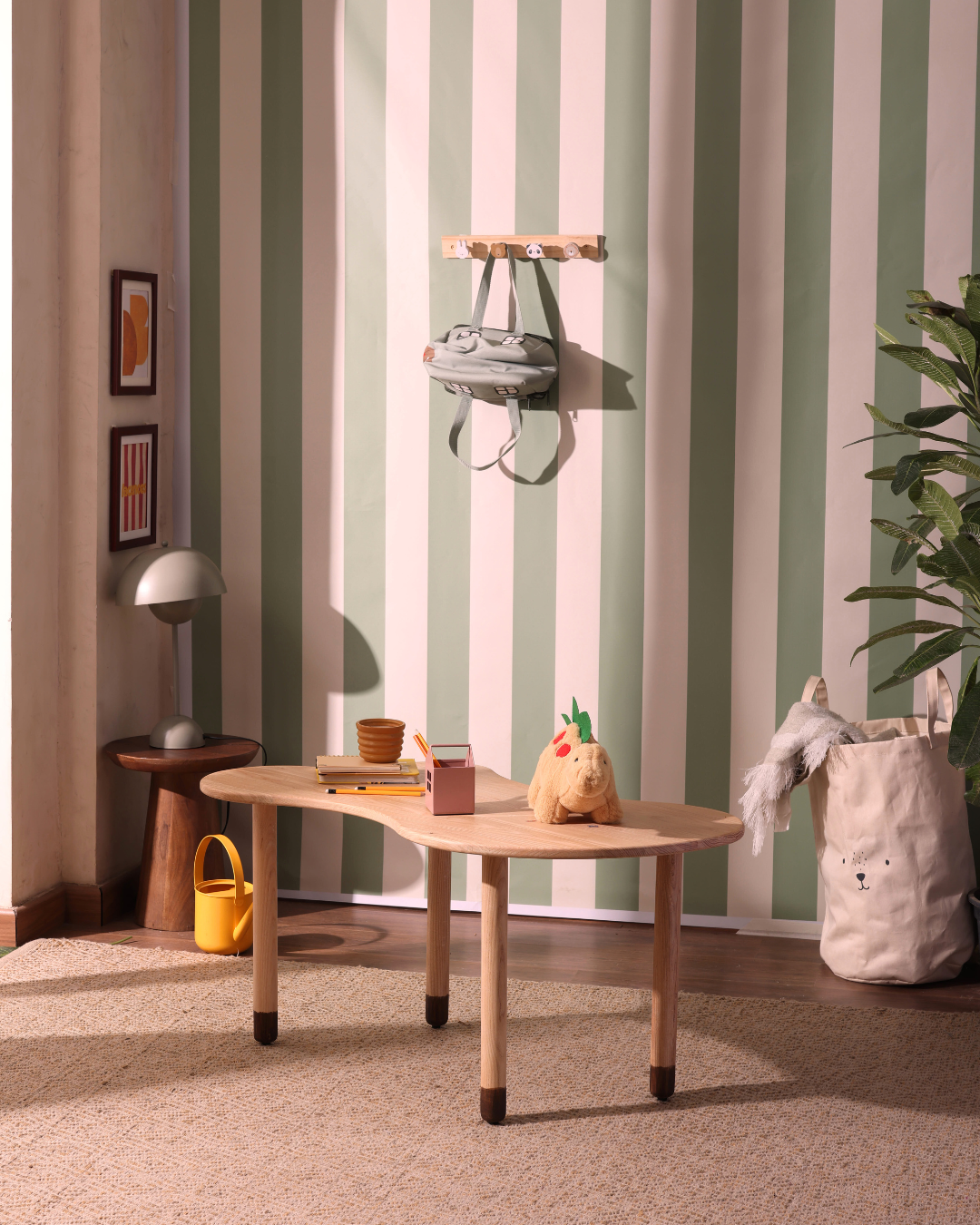 This modern wooden kids’ activity table features a playful, organic shape that blends functionality with style. Crafted from smooth, natural wood, it rests on sturdy rounded legs with contrasting dipped ends for a charming finish. Its spacious dual-surface design offers plenty of room for play, drawing, reading, or crafts, making it perfect for a child’s bedroom, playroom, or creative corner. With its soft edges and warm tones, the table adds a cozy aesthetic to any space while ensuring safety and durability for everyday use.